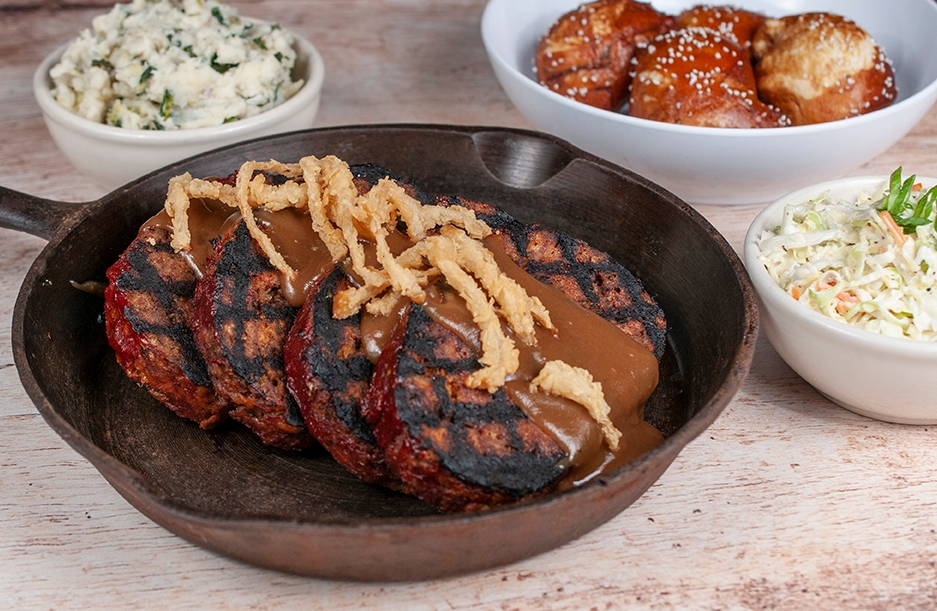 Two pieces of our house crafted meatloaf, with pan gravy and crispy onions. Four pieces of our chicken fried chicken thighs with country gravy. Comes with choice of side, coleslaw and an order of freshly baked pretzel rolls.