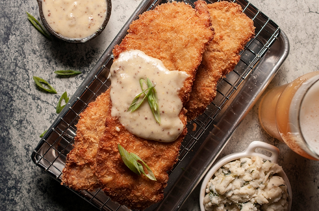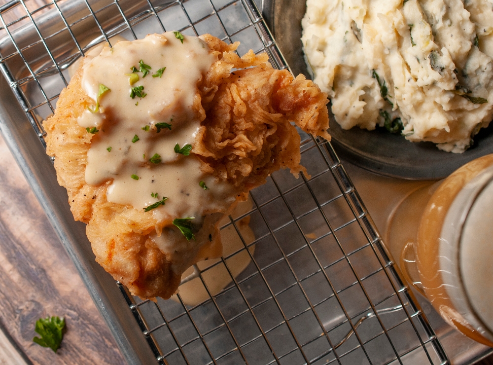 Breaded in-house boneless thighs with herbs and spices, country gravy.
