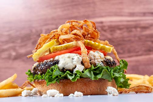 Beef patty, blackening seasoned, bleu cheese, onion straws