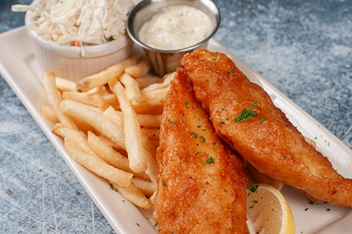 8 pieces beer battered Cod, crispy French fries, large side of fresh Coleslaw, house tartar sauce.