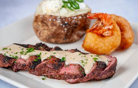 Center cut sirloin with whiskey cream sauce, beer battered shrimp with citron black pepper cocktail sauce