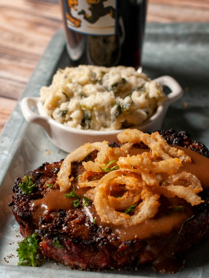 Irish stout pan gravy, onion straws