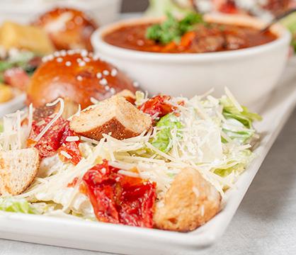 Romaine lettuce, creamy garlic dressing, sundried tomato, pretzel croutons, parmesan cheese