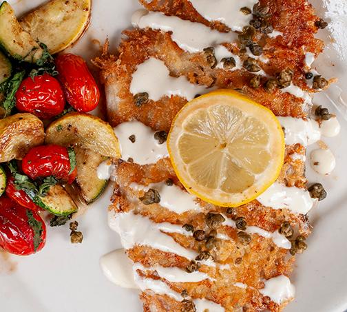 Served gratin style with veggies